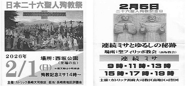 *日本二十六聖人殉教記念ミサ(14時 西坂公園) ※徒歩巡礼参加者は聖ルドビコ像前に12時30分集合 *評議会(19時 信徒会館) |